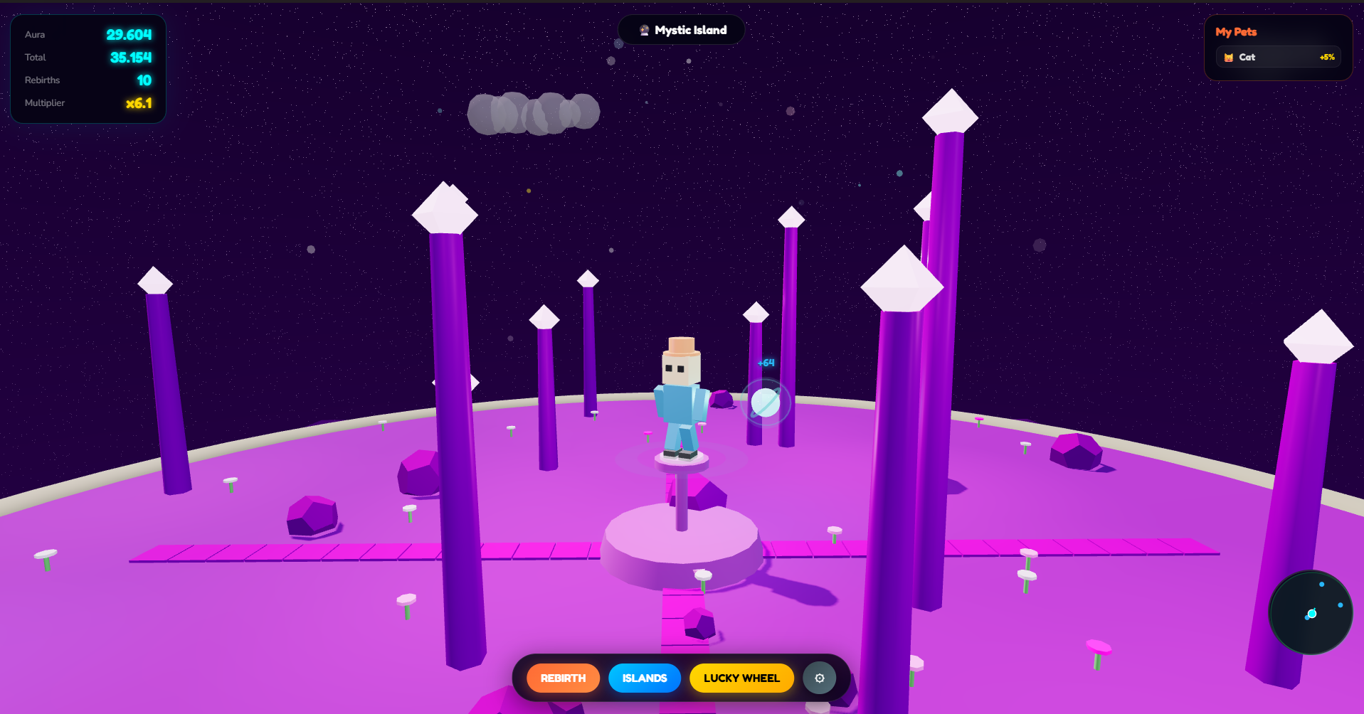 What is Aura Game? You land on a beautifully floating island, rendered entirely in 3D using WebGL directly in your browser. Glowing aura orbs of various colors and rarities spawn all over the island. Your goal: Collect as many orbs as possible, grow stronger, unlock new worlds and level up.